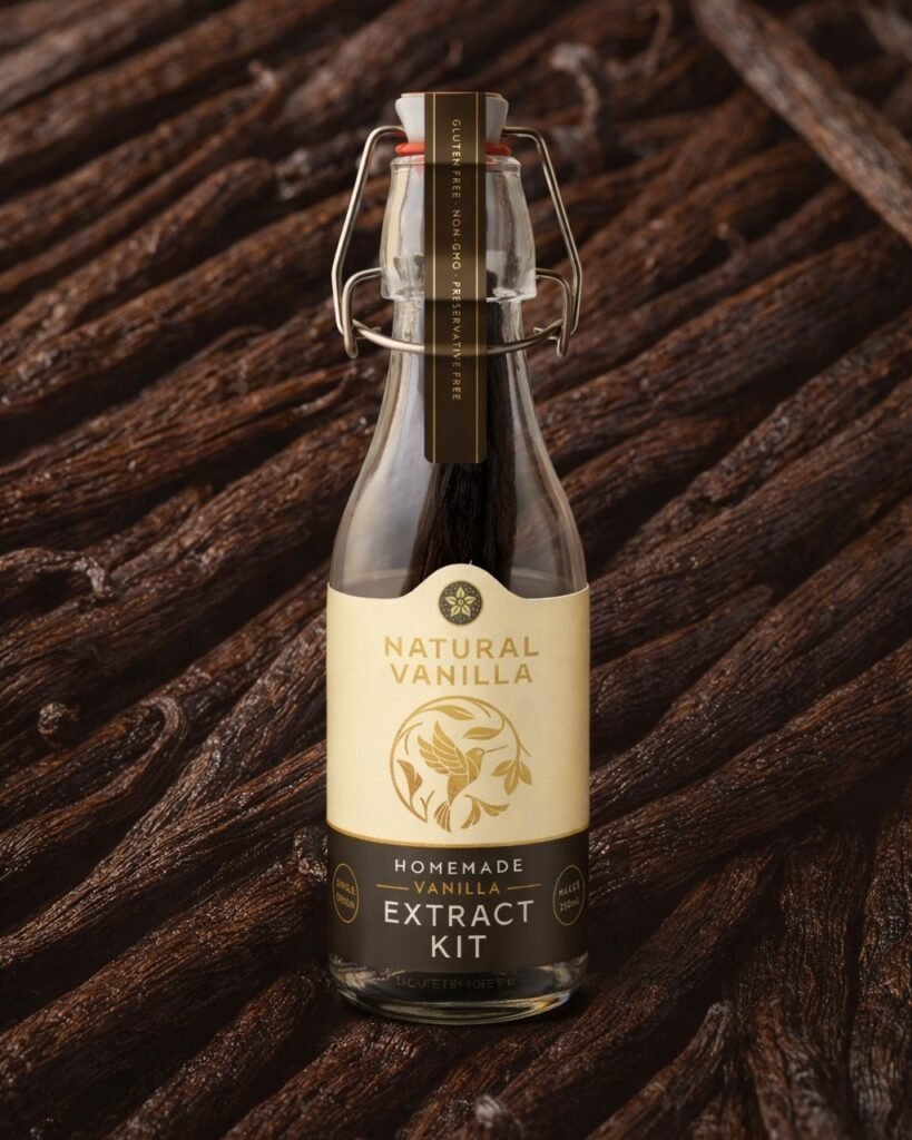 Make your own vanilla extract at home. It smells amazing, looks beautiful, and it feels oddly satisfying to make something proper from scratch. Each kit includes 25 g Tahitian vanilla pods from Papua New Guinea and a 250 ml swing-top bottle.